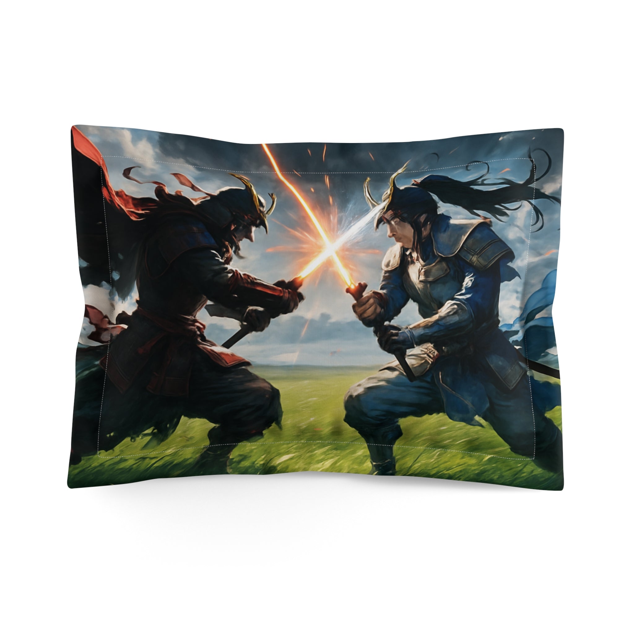 Decorative Samurai Clash Pillow Sham for Anime Lovers, adds a futuristic vibe to bedroom decor. Perfect unique gift for those who enjoy anime and want to enhance their bedding. Suitable for adults. Ideal for decorating during anime conventions, birthdays, or holidays.